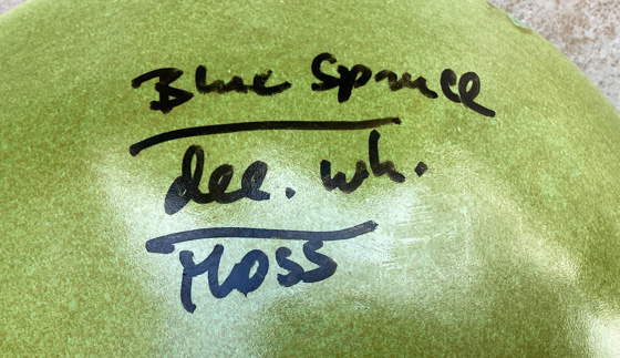 - Another possibility is that it is a hobbyist piece, created from a mold sold by Haeger and decorated in a local pottery shop. Both Blue Spruce and Moss are popular glazes in such shops, and the teachers often put hand-written annotations on pieces as glaze samples for their students.