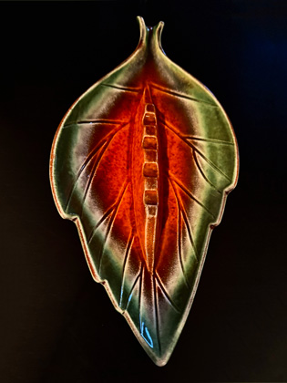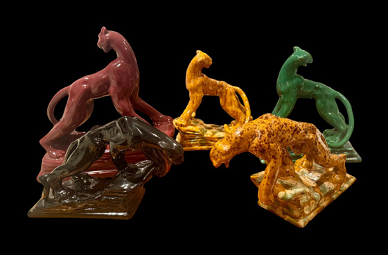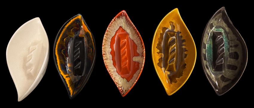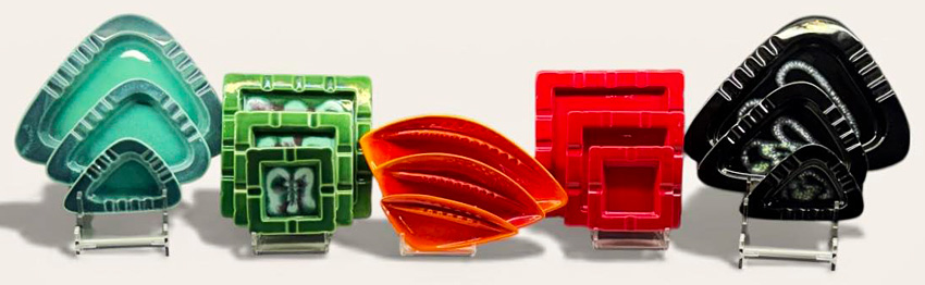 Designs left to right, large to small: R-1673, R-1674 & R-1675 in Turquoise Green Decorated; R-1429, R-1430 & R-1431 in Green Cascade; 1039, 1029 & 1040 in Mandarin Orange; R-1429, R-1430 & R-1431 in Haeger Red; and R-1673, R-1674 & R-1675 in Ebony Cascade