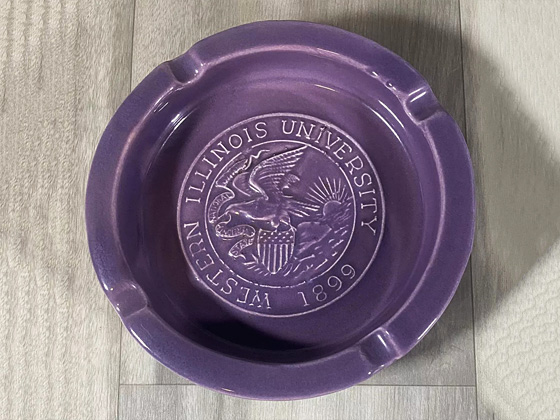 Circa unknown ≈6", unidentified glaze reflecting one of WIU's school colors of purple and gold, photos courtesy sfde-67 on eBay