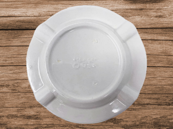 Circa unknown ≈5¼", Gloss White glaze with black lettering, photo from the collection of Gail Peterson Daley