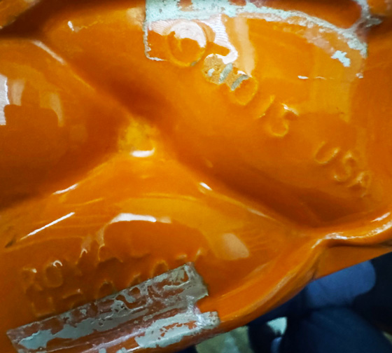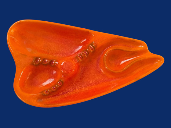 Free Form Ashtray with Pipe Rest 11" circa 1964-1965, Mandarin Orange glaze, photos from the collection of Allen Rothpearl