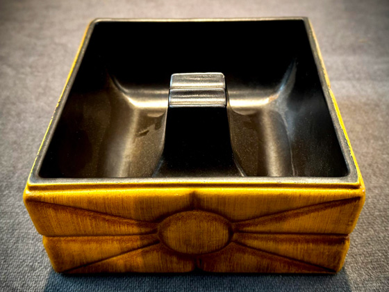 Square Ashtray 6" circa 1968-1970, Peasant Gold glaze with matte black liner, photos from the collection of Allen Rothpearl