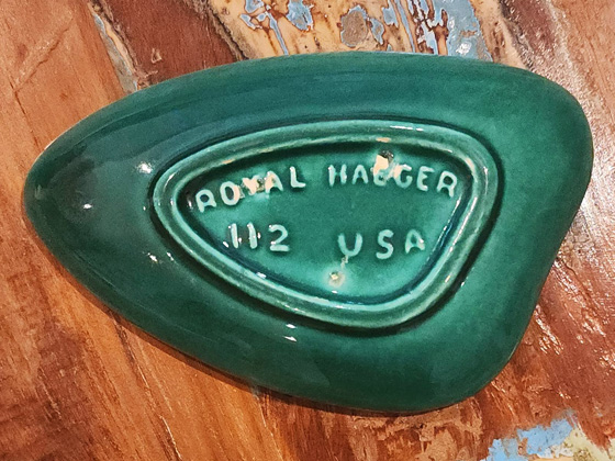 Free Form Miniature Ashtray 5" circa 1960-1961, Emerald Jeweltone glaze also listed in catalogs as Emeraldtone, photos from the collection of Janet Letteney Dreitlein