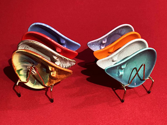 Sculptured Miniature Ashtrays 4½" with Stand circa 1960-1963, Briar Agate, Gold Tweed, Haeger Red, Lilac, Turquoise Blue, White Crackle, Mandarin Orange, and Lilac glazes, photos from the collection of Michael Bono
