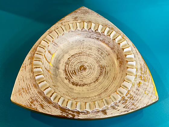 Triangular Modern Ashtray 10" circa 1963, Gold Tweed glaze, photos from the collection of Troy LaFollette
