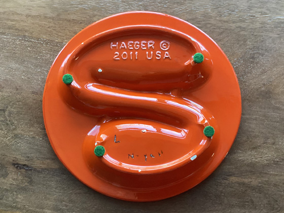 This ashtray was not manufactured by Haeger, but rather the mold was sold from a Haeger molds catalog. We haven't found a mold catalog with this ashtray design in it, so the date the ashtray mold was sold is unknown. We do know that ashtrays of this design manufactured for sale by Haeger were listed in catalogs 1969-1974.