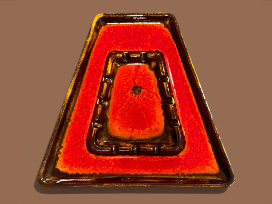 Ashtray 8½" circa 1969-1970, Orange Jewel Tone surrounded by Gold Spice glaze, photos from the collection of Allen Rothpearl
