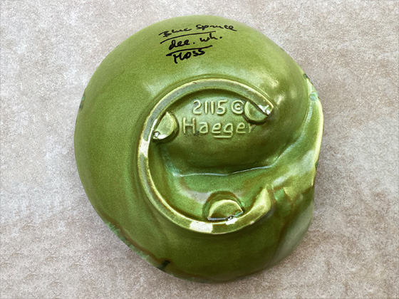 - Another possibility is that it is a hobbyist piece, created from a mold sold by Haeger and decorated in a local pottery shop. Both Blue Spruce and Moss are popular glazes in such shops, and the teachers often put hand-written annotations on pieces as glaze samples for their students.