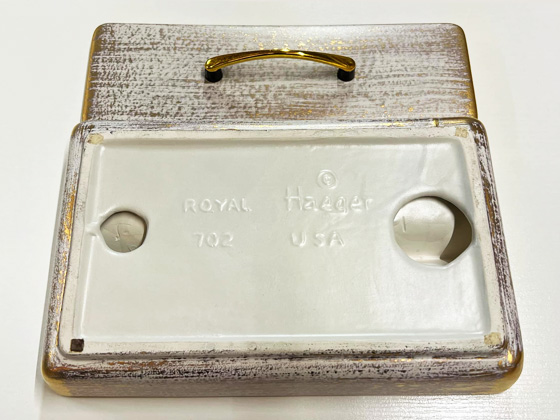 Rectangular Ashtray Cigarette Box Combo 10" circa 1959-1967, Gold Tweed glaze, photos from the collection of Troy LaFollette