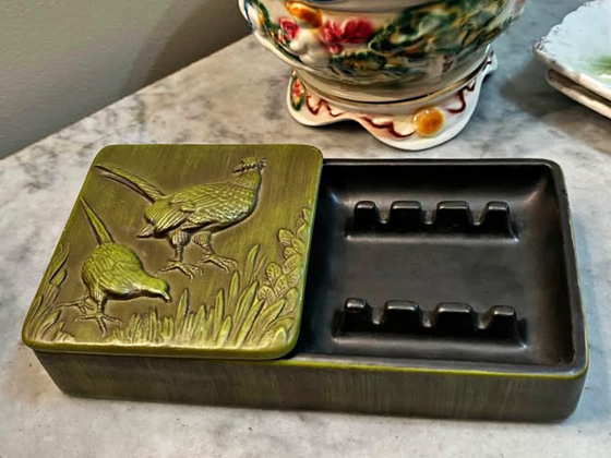 Ashtray Cigarette Box Combo 8" (see Note) circa 1969-1970, Peasant Olive glaze with matte black liner, photos courtesy Mary Frances Enloe on Facebook's Marketplace