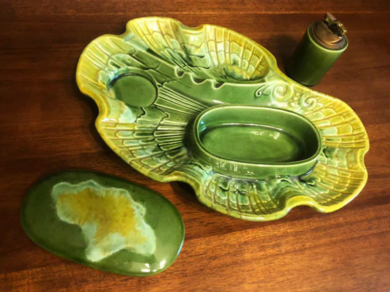 Ashtray, Cigarette Box & Lighter (SP-42) Combo not found in a catalog ≈14", Fern Agate glaze circa 1968-1974, photos from the collection of Cambria Knight-Lucas