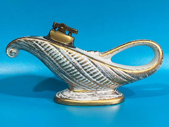 Aladdin Lamp Cigarette Lighter 8½" circa 1961-1964, Gold Tweed glaze, photos from the collection of Troy LaFollette