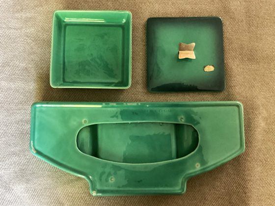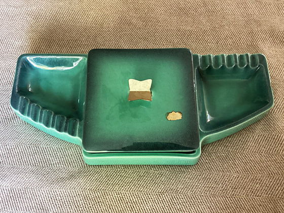 Executive Ashtray Cigarette Box Combo 17" circa 1956-1957, Turquoise Green Decorated glaze, photos from the collection of Michael Bono