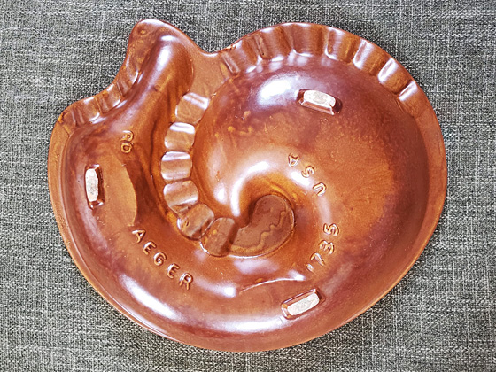 Shell Ashtray 11½" circa 1957-1976, Tawny Cedar glaze, photos from the collection of Jon Walters
