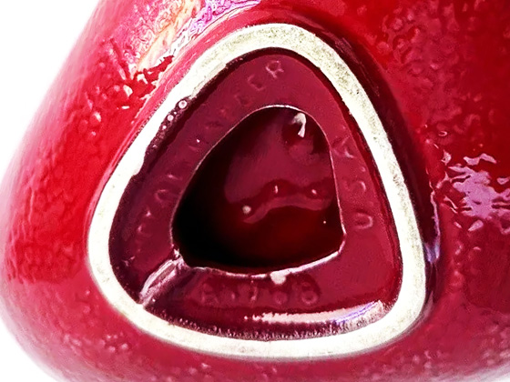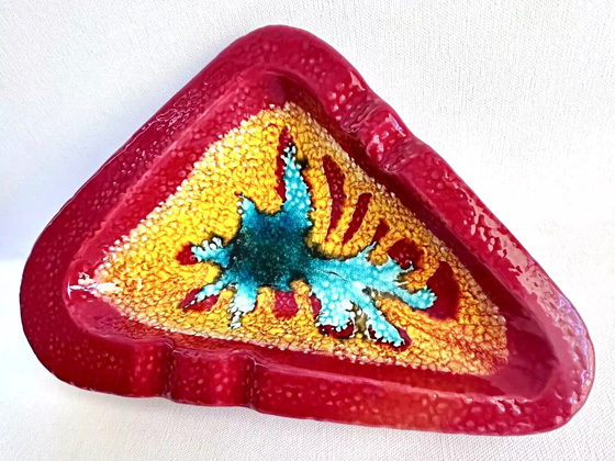 Triangular Ashtray 10" circa 1958, Ruby Jeweltone glaze also listed in catalogs as Rubytone, photos courtesy makeityours-kts on eBay